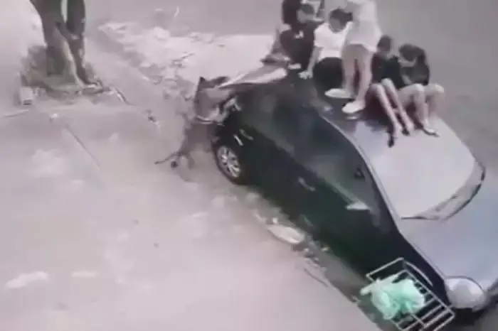 Crianças sobem no teto de carro para fugir de ataque de pitbull