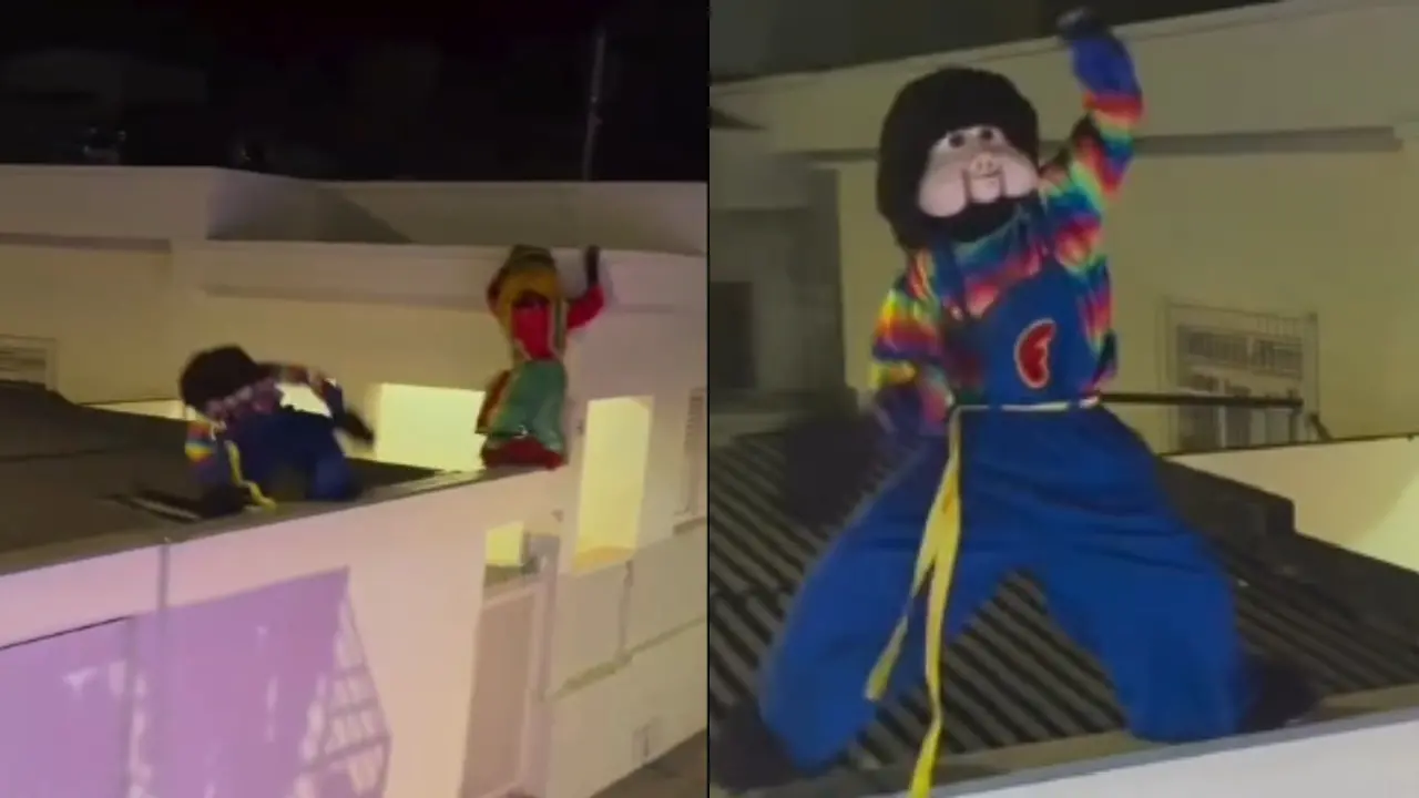 Um dançarino da "carreta furacão" fantasiado de Fofão caiu sobre o telhado de uma oficina, em Itaú de Minas (MG), no último sábado (27). O vídeo da queda tem repercutido nas redes sociais.