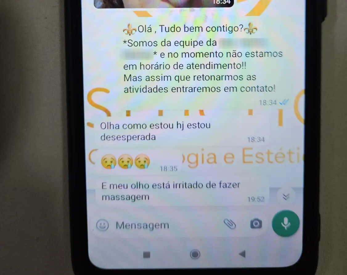 No celular utilizado pela clínica para falar com pacientes, os agentes da Polícia Civil encontraram conversas que indicam casos de consumidores que ficaram com rostos deformados após cirurgias realizadas com a profissional e/ou com os “alunos” dela.