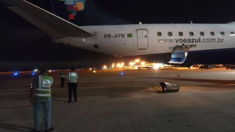 Sobre o mesmo caso, a Azul Linhas Aéreas pontuou que a aeronave estava vazia e parada para pernoite. Ela, um Embraer E195-E1, teria sido atingida na "parte traseira da fuselagem" durante o procedimento de táxi da outra aeronave.