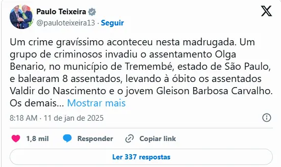 Também no X, o ministro do Desenvolvimento Agrário e Agricultura Familiar, Paulo Teixeira, classificou a ocorrência como “um crime gravíssimo”. “Comuniquei o crime ao secretário de segurança pública de São Paulo e pedi as providências para a investigação dos autores e a prisão deles”.