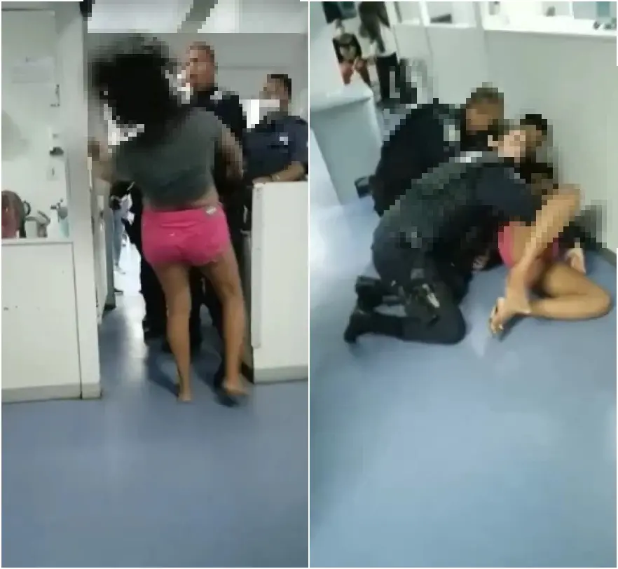 Thaise Fernanda dos Santos, 31 anos, aparece em vídeo sendo empurrada após discutir com funcionárias da Unidade. A Polícia Militar é chamada e Thaise acaba sendo presa.