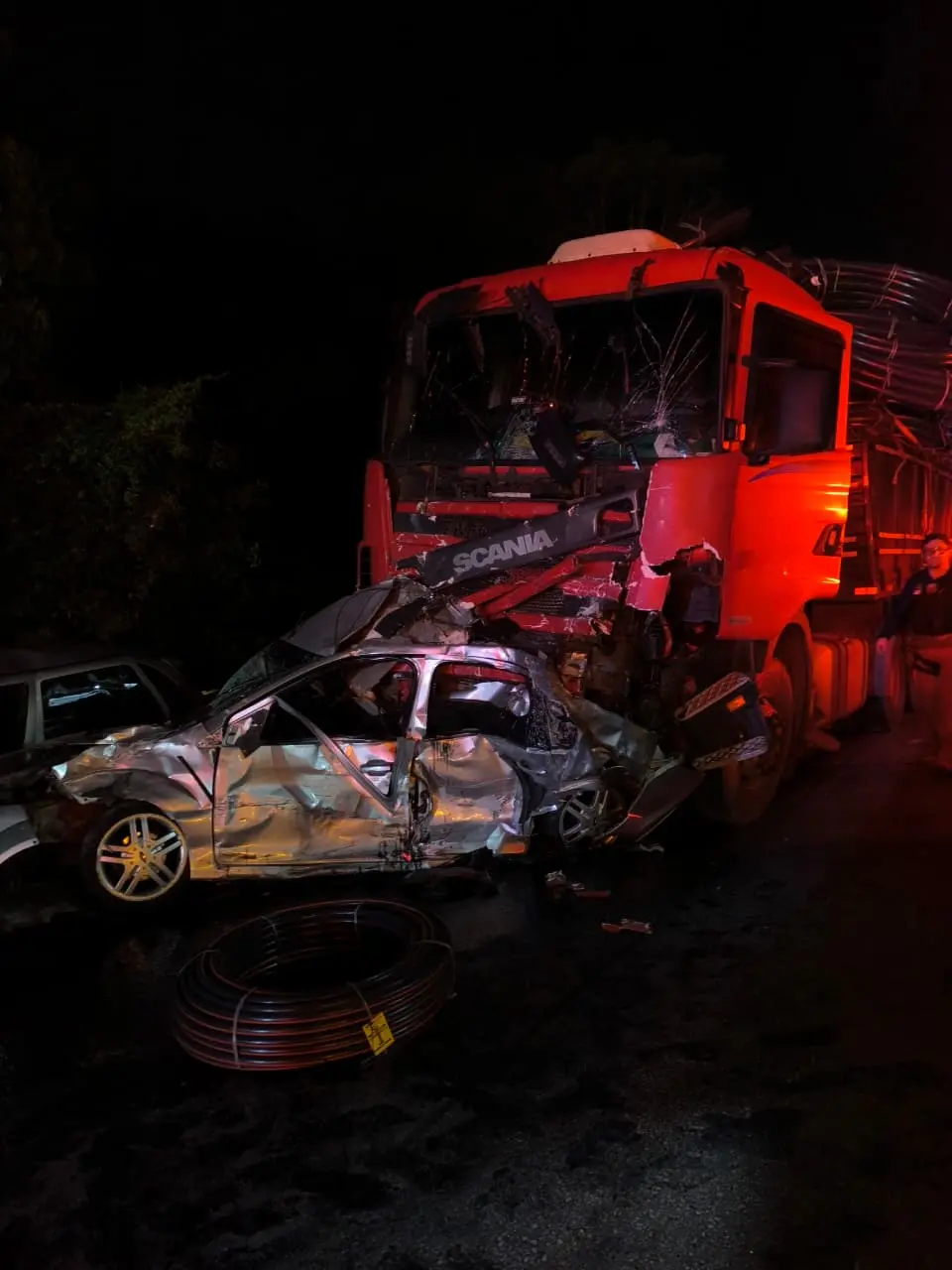 O Corpo de Bombeiros Militar informou que duas pessoas estavam presas às ferragens de um automóvel Fox. Tratam-se do homem que morreu no local e de uma mulher, resgatada com vida e levada ao hospital.