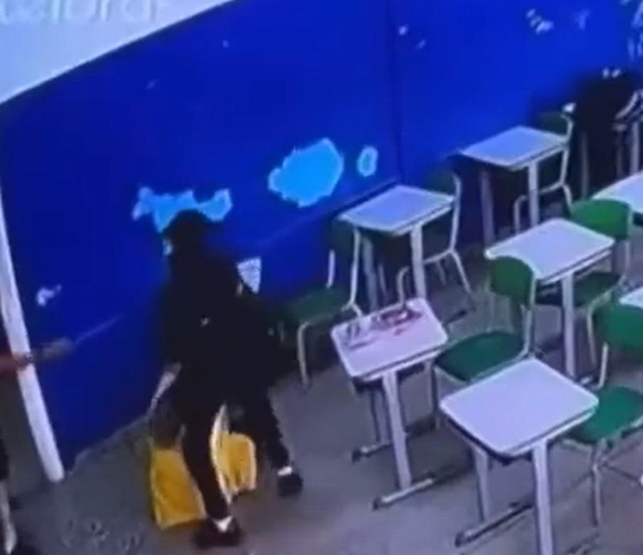 Nas imagens, é possível ver a professora de educação física entrando na sala e vendo o aluno com o rosto coberto com uma máscara, esfaqueando a professora. A partir daí, ela vai ao encontro do adolescente e consegue imobilizá-lo. Na sequência, outra professora aparece na sala e consegue tirar a faca da mão do jovem.