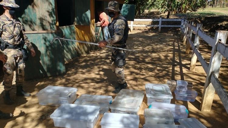 O major Elis Cunha, do BPMA, explicou que as cobras estavam dentro de caixas, escondidas em uma baia de cavalo. O caseiro da fazenda disse aos policiais que o amigo da vítima deixou os animais no local.