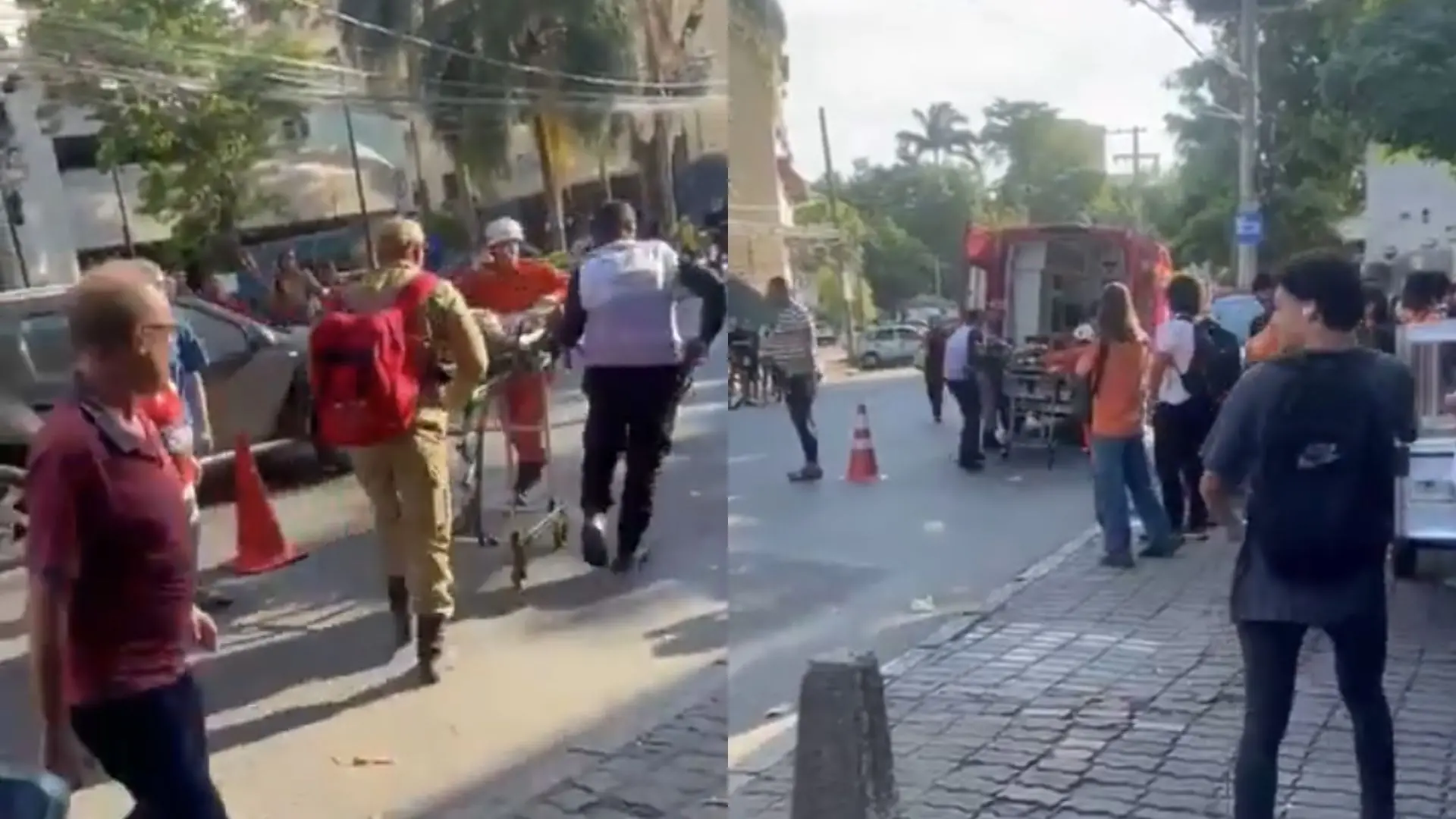 Outro vídeo mostra um ambulância e bombeiros retirando o corpo de uma mulher em uma maca.