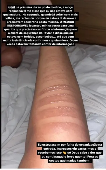 Fã de Taylor Swift mostra fotos de queimaduras na perna e revela: ‘Tinha gente vomitando, desmaiando