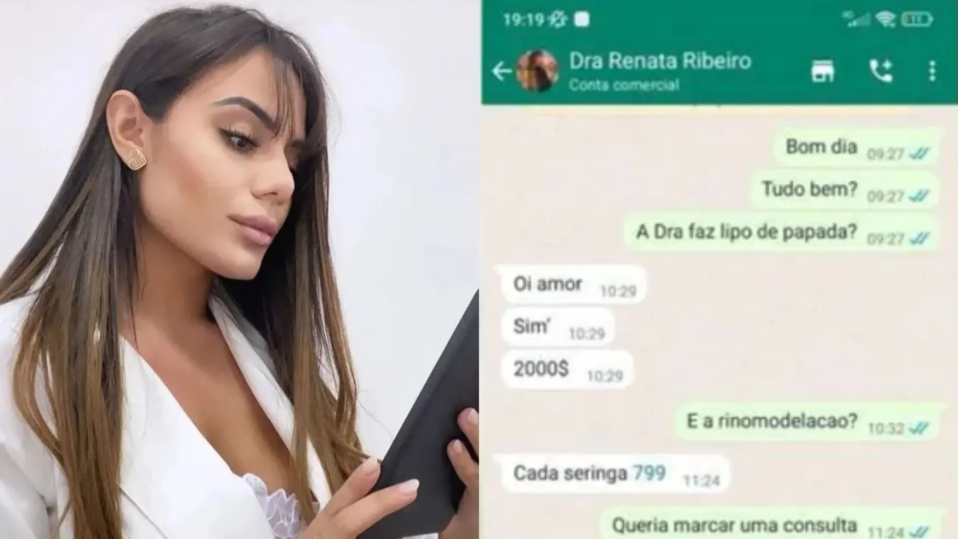 Um print de uma conversa no WhatsApp mostra que a mulher cobrava R$ 2 mil para fazer uma lipoaspiração da papada e R$ 799 a seringa para uma rinomodelação. Ela será investigada por falsificação de documento público e exercício ilegal da medicina.