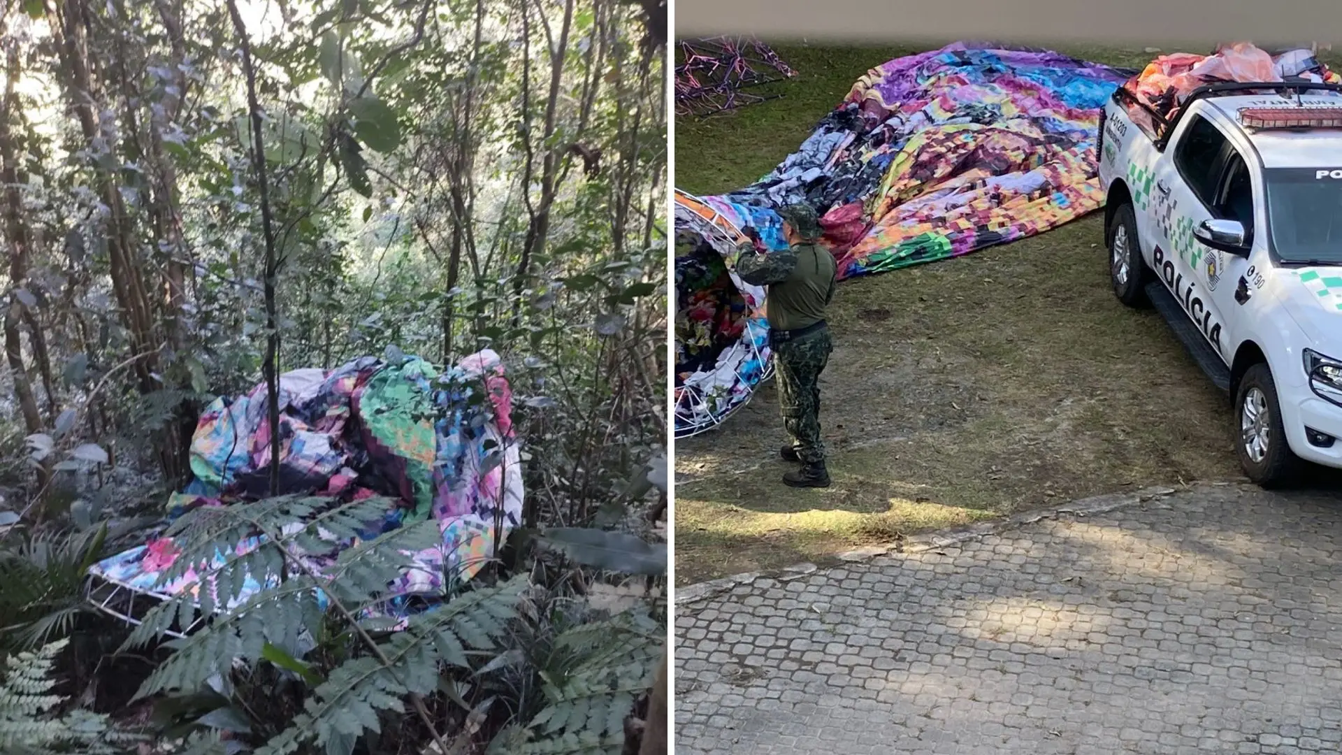 Depois de mais de 1h30 de buscas pela mata, os policiais encontraram quatro homens carregando partes do balão usadas para sustentar e direcionar o artefato durante o voo.