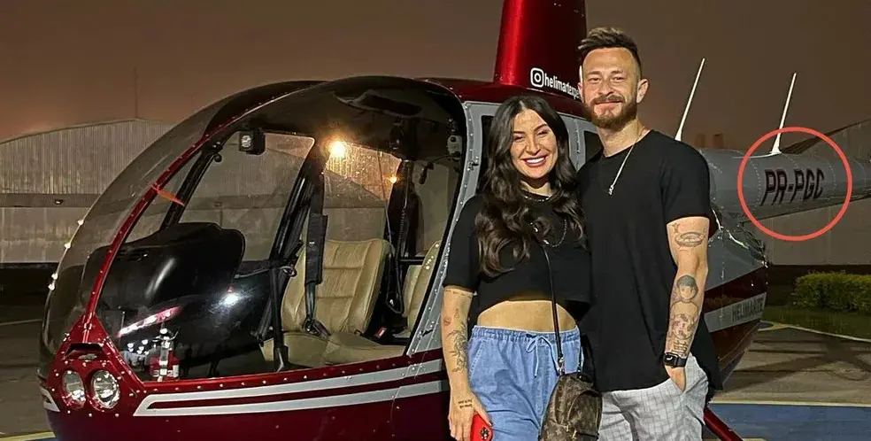 O helicóptero envolvido no acidade é um Robinson R44 II de prefixo PR-PGC, o mesmo que aparece atrás do ex-casal na foto abaixo. A sigla é como uma identidade da aeronave.