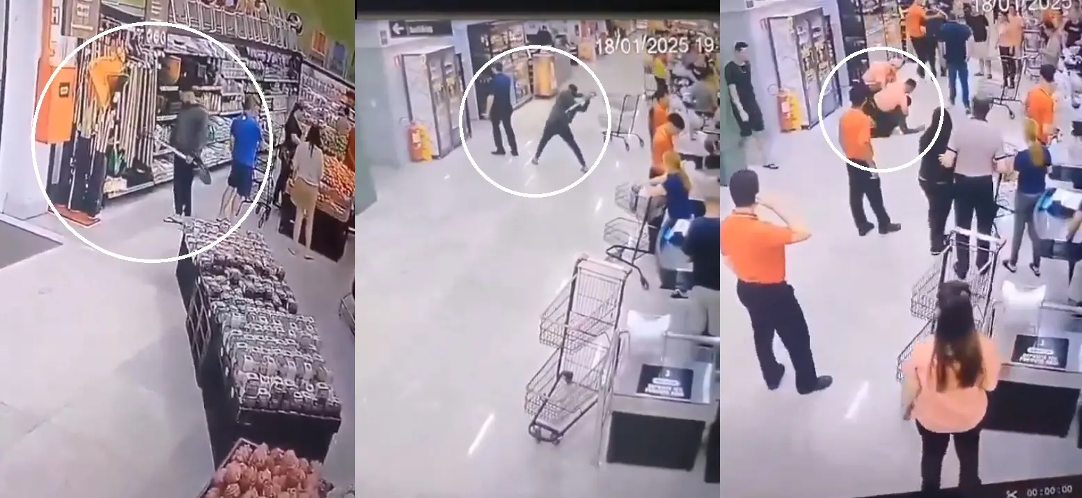 Nas imagens registradas pelas câmeras de segurança e divulgadas nas redes sociais, o suspeito aparece entrando normalmente no estabelecimento e caminhando até uma prateleira, onde pegou uma pá.