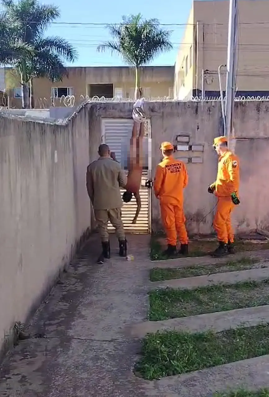 Um homem precisou ser resgatado pelo Corpo de Bombeiros ao tentar pular o muro de um condomínio e ficar nu em Águas Lindas de Goiás, entorno do Distrito Federal (DF), na última segunda-feira (12). O calção dele ficou preso na cerca elétrica do portão que dá aceso a uma casa, e pessoas que presenciaram a cena pediram ajuda.