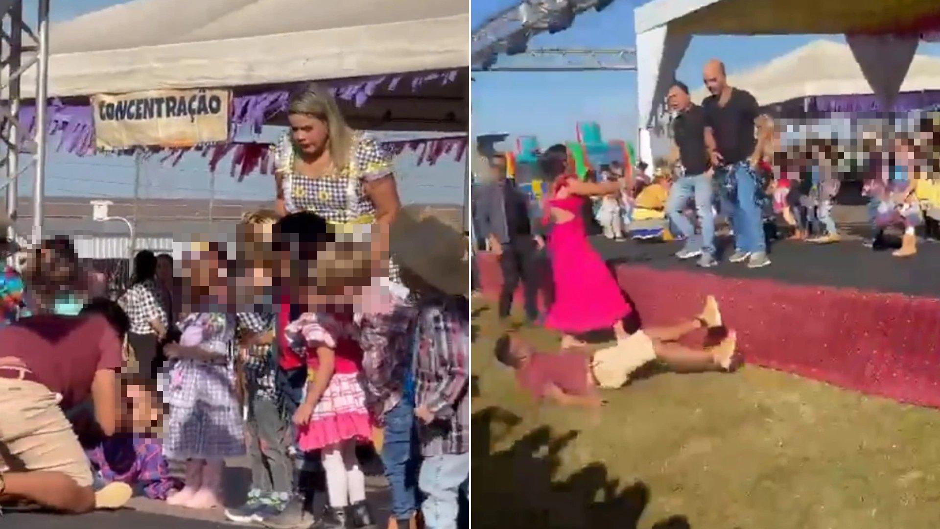 - Um grupo de alunos da Educação Infantil dançava no palco quando um menino enfiou o dedo no olho de outra criança. Imagens gravadas por quem estava na plateia mostram que, diante do desentendimento entre os pequenos, um homem invadiu o palco e derrubou o garoto no chão, chegando a segurá-lo pelo pescoço.