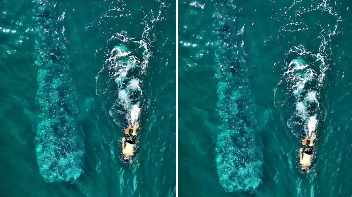 Homem nada ao lado de tubarão-baleia no litoral de São Paulo; veja vídeo