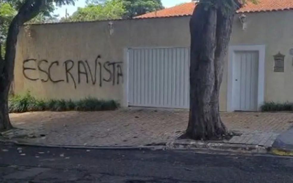 Nesta quinta-feira (8), a fachada da casa de Hamilton e Maria de Fátima foi pichada com a palavra "escravista".