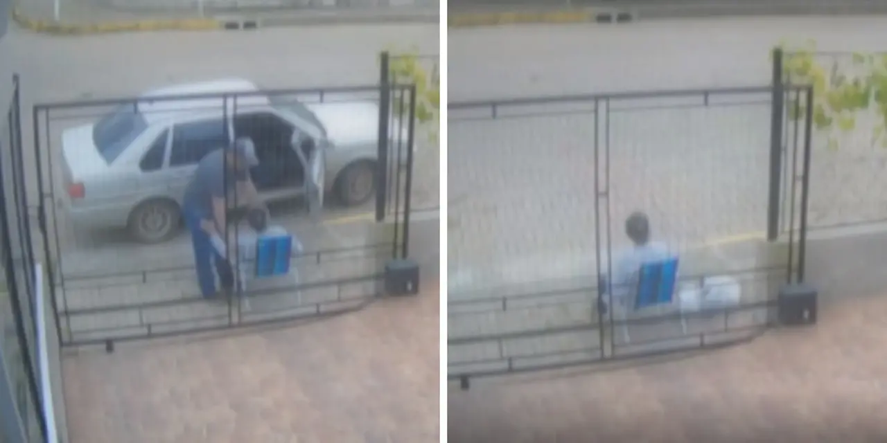 As imagens mostram que o filho parou o carro em frente a uma casa e retirou uma cadeira de praia do veículo. Ele carregou o idoso para a cadeira e o deixou sentado na entrada da residência.