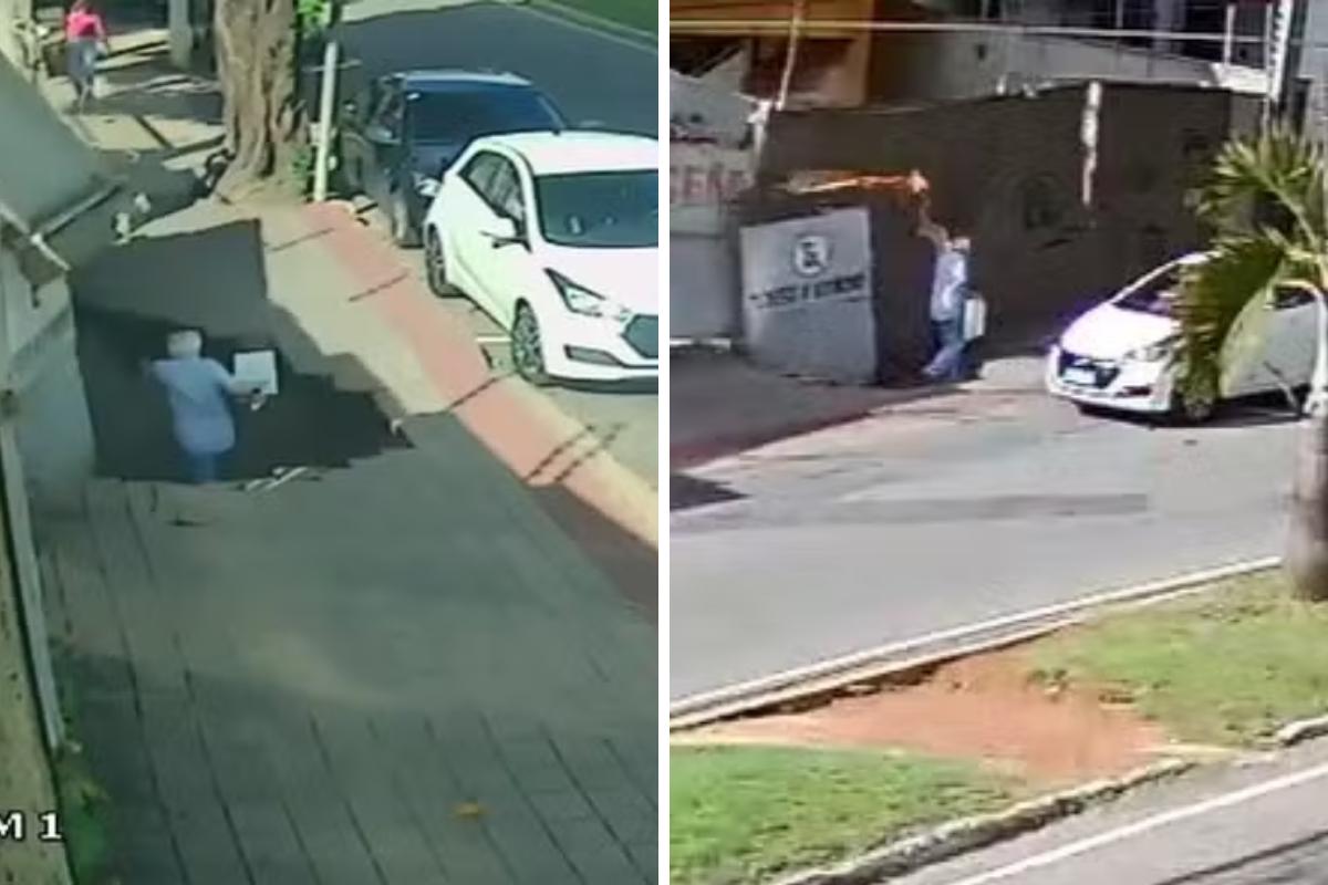 Em imagens de câmera de segurança, é possível ver o homem caminhando pela calçada, com uma sacola na mão. Ao ficar na frente de um terreno com placas de proibido estacionar, a calçada cede e parte do muro cai em cima dele. O piso pareceu "oco".