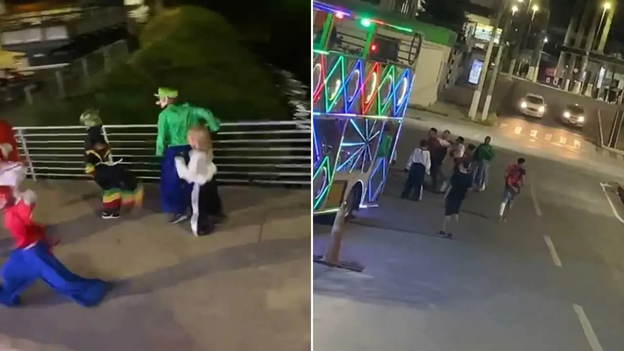 A confusão aconteceu quando os integrantes se encontram. Nas imagens é possível perceber quatro personagens dançando nas imediações de um cruzamento. Em seguida, o grupo se encontra com outros quatro artistas de uma carreta que estava parada.