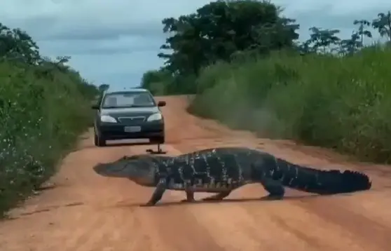 No vídeo, é possível ver veículos parados enquanto o animal atravessa lentamente a estrada rural. As imagens foram compartilhadas e viralizaram nas redes sociais.