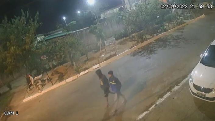 Segundo o vídeo obtido pela TV Brasília, dois homens de bermuda e jaqueta com capuz caminham por uma rua e passam pelo casal, que está logo à frente sentado num banco de concreto.