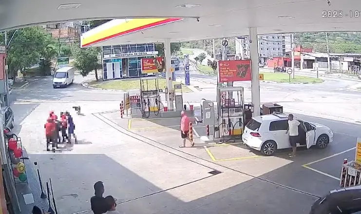Outros funcionários e um cliente também entram na confusão e agridem o suspeito. O homem que pilotava a moto, antes de fugir, conseguiu subtrair o celular de uma cliente do posto.