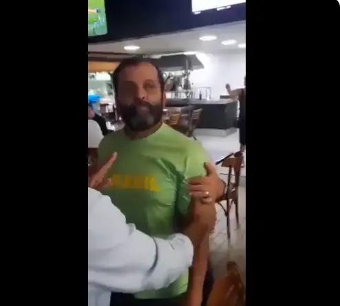 Um vídeo do momento mostra o empresário sendo controlado por pessoas que estavam no local. Ele grita palavras de intimidação, como "Vou te dar uma porrada" e "O malandro tá de volta".