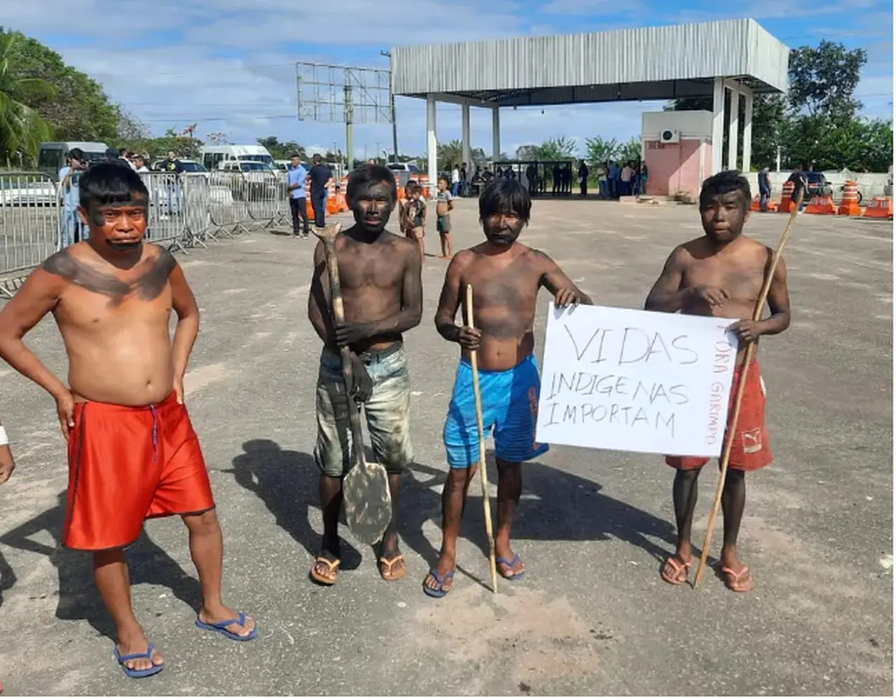Indígenas recepcionaram o grupo e alguns seguravam cartazes com dizeres como "Vidas indígenas importam" e "Fora garimpo".