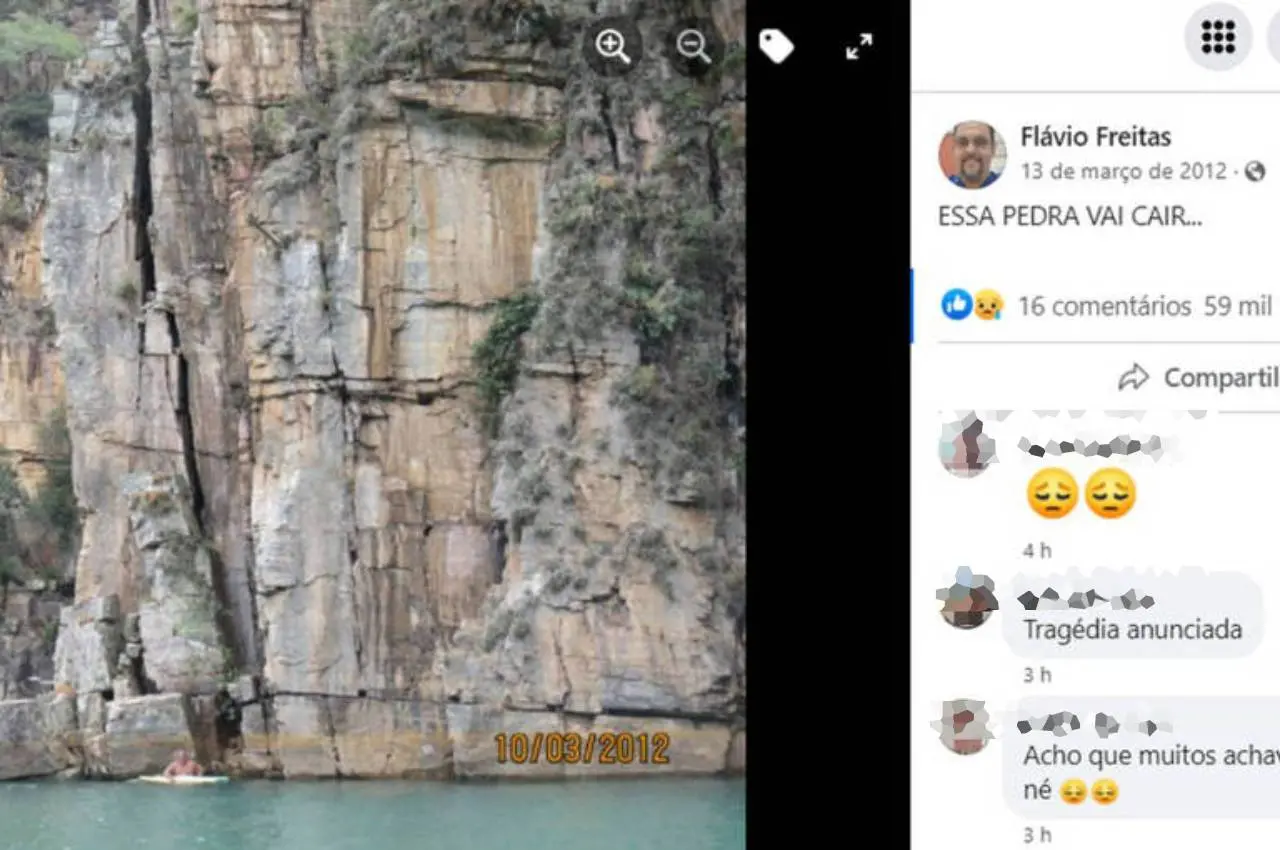 Há quase dez anos, o médico Flávio Freitas, 52, previu o desabamento da rocha em Capitólio (MG). Era março de 2012 quando, ao passar de barco pelo cânion, uma enorme fenda chamou sua atenção. O registro foi feito em suas redes sociais alertando para o risco da queda.