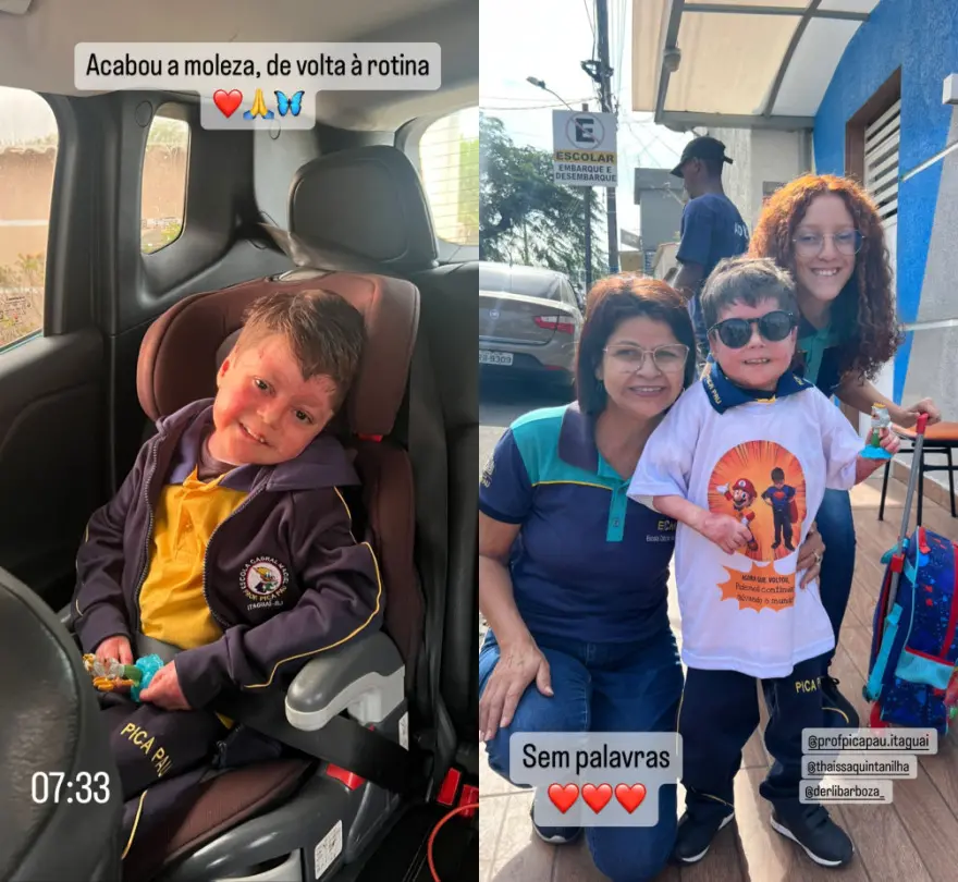 O perfil da escola também publicou um vídeo com o retorno do garoto às atividades escolares. "Depois de mais de 30 dias, ele volta à um dos ambientes que ama, onde aprende brincando, dança e sorri sem limites", escreveram.