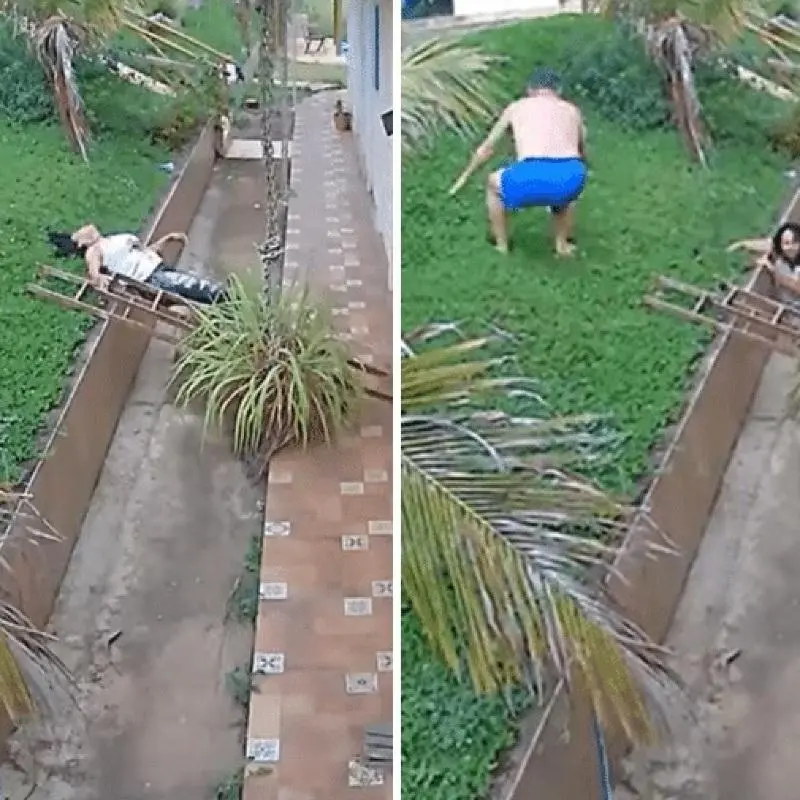 Mulher cai de telhado e marido pula para salvar esposa; veja vídeo