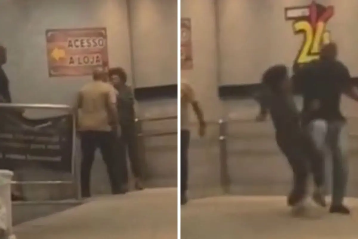 Ela faz o que o homem manda e mesmo assim ele continua as ameaças. A mulher é puxada pelos braços por dois homens e um funcionário de camisa preta empurra e dá uma rasteira nela, que cai e bate a cabeça.