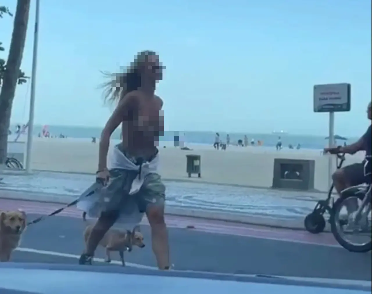 Uma mulher foi detida por guardas municipais, em Balneário Camboriú, após ser flagrada fazendo topless enquanto passeava com cachorros na Avenida Atlântica. O caso foi registrado no último sábado (13).