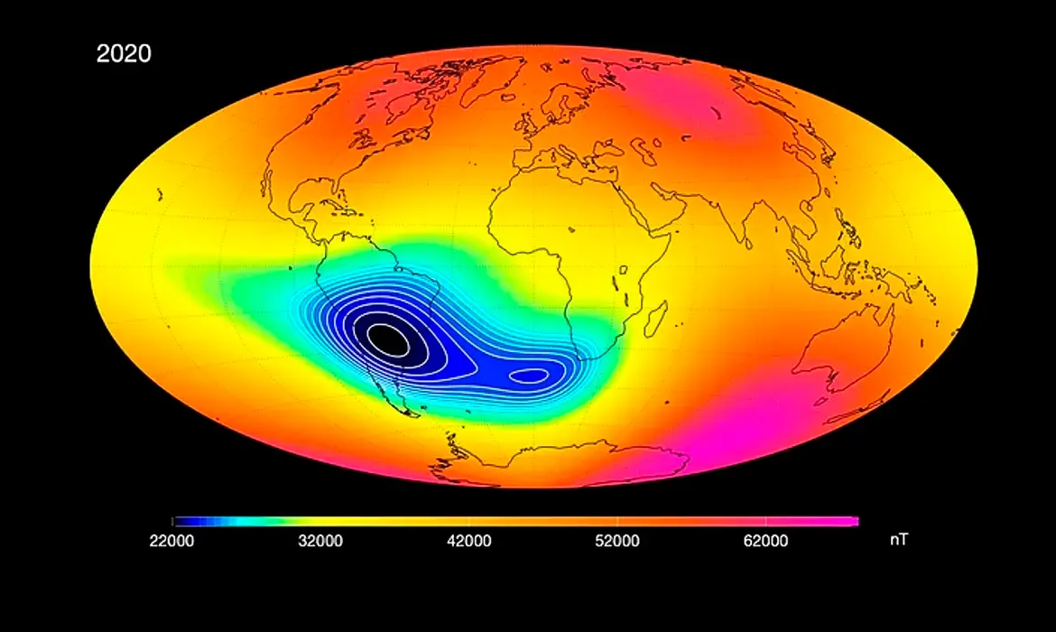 A intensidade do campo magnético nessa área do planeta chega a ser um terço da média que é no restante do globo, mas não há um motivo exato para essa "falha" existir.