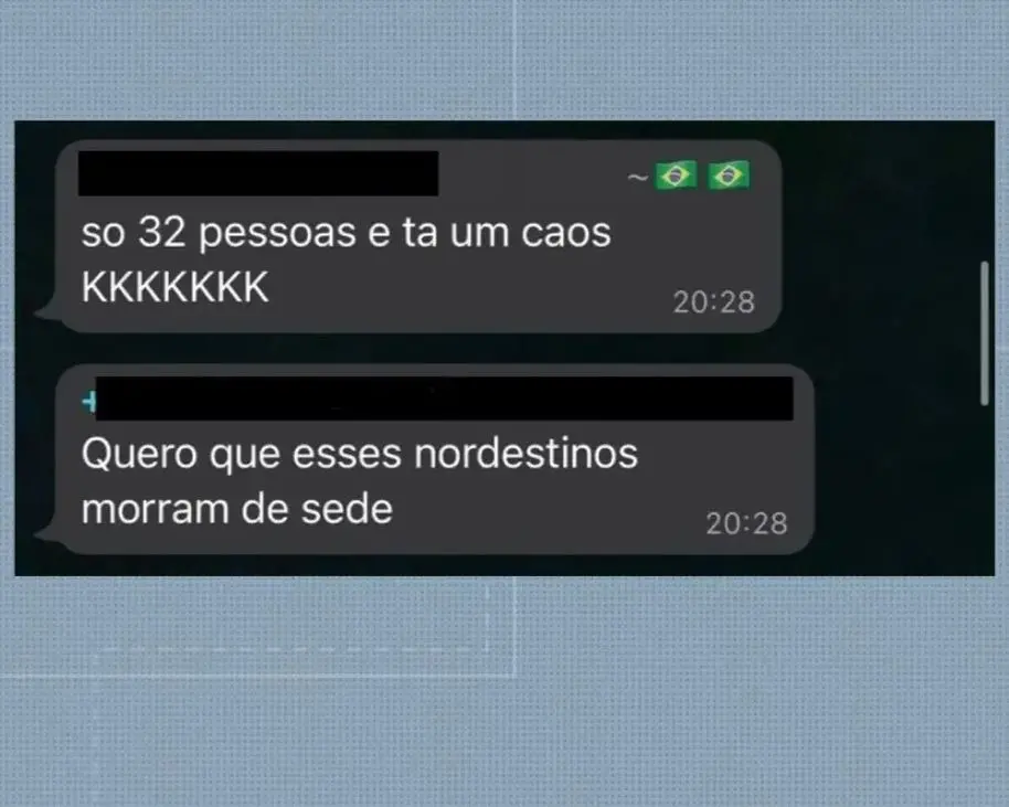 "Quero que esses nordestinos morram de sede", disse um dos membros do grupo, em horário próximo do resultado das Eleições, que definiu Luiz Inácio Lula da Silva (PT) como o novo presidente do Brasil.