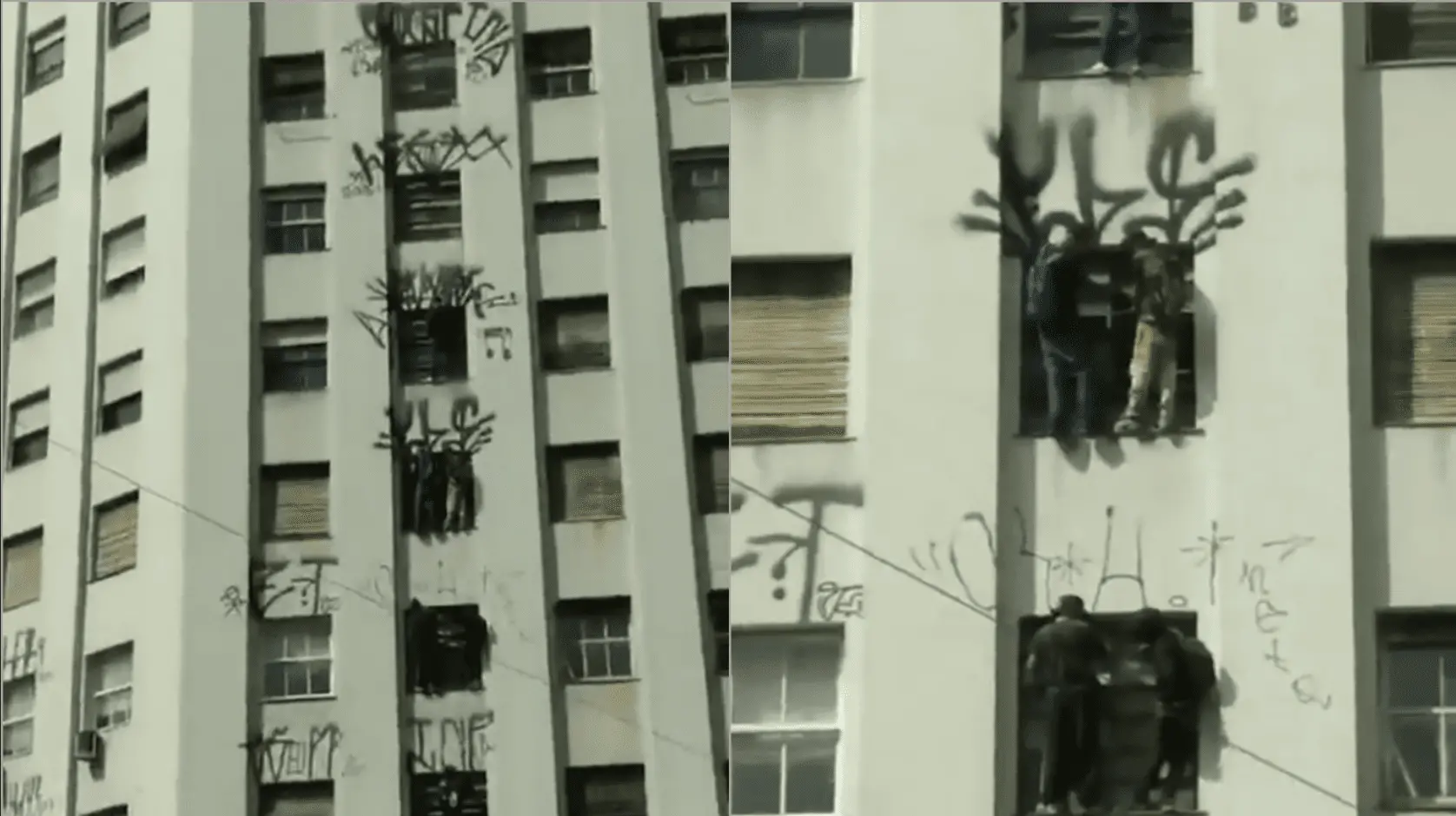 Em fotos divulgadas nas redes sociais, é possível ver os oito pichadores pendurados em janelas do prédio. Eles estavam com roupas pretas e encapuzados.