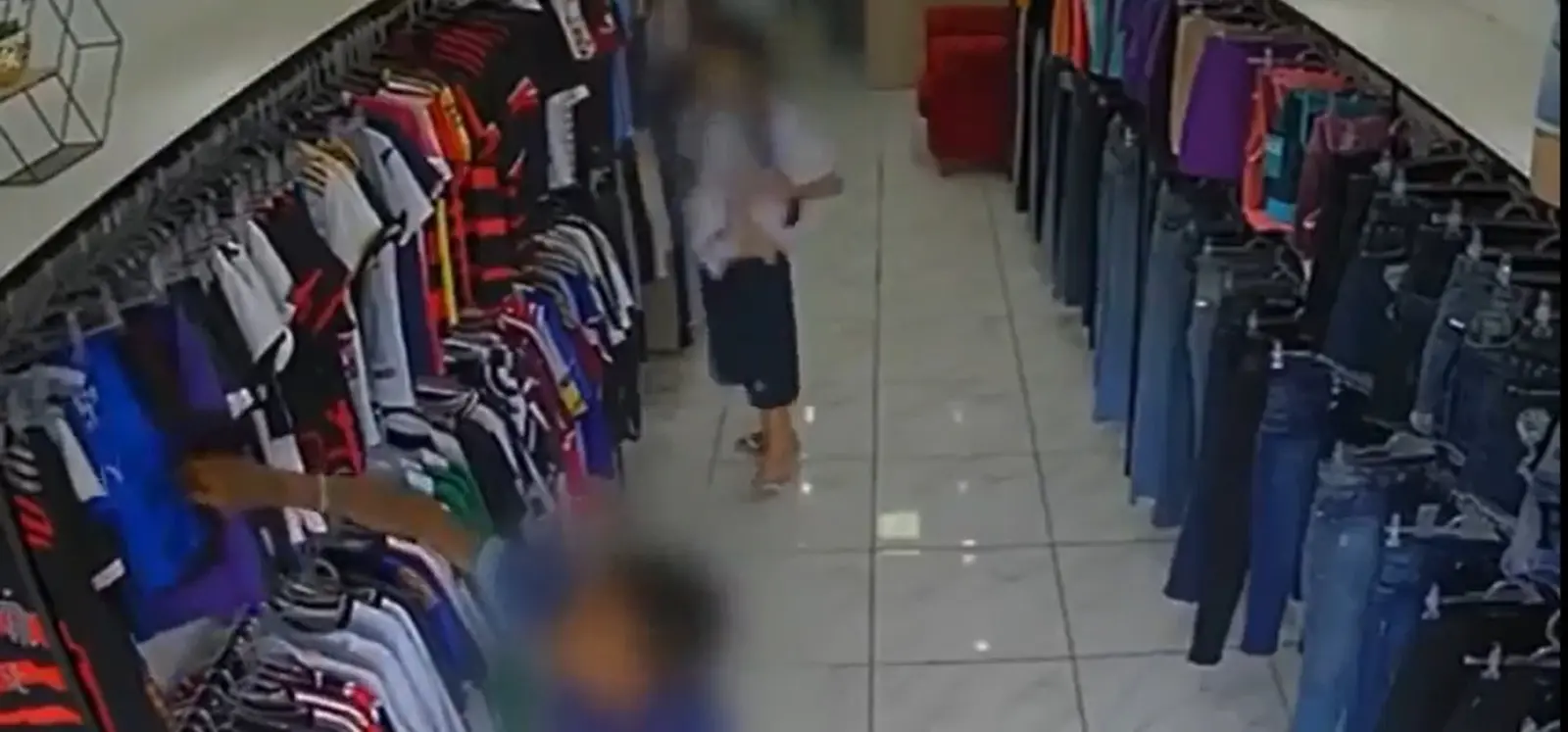 A câmera de segurança da loja registrou o momento exato do furto. Nas imagens, o menino, que aparenta ser uma criança, aparece acompanhado de dois adolescentes e pouco tempo após entrar no local pergunta ao vendedor onde é o banheiro. Os dois vão até o fundo da loja.