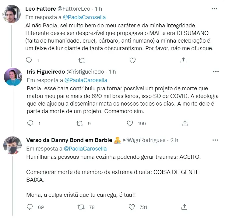 Um usuário da rede social respondeu o comentário de Paola Carosella lembrando das famílias que perderam parentes pela Covid-19. "Diz isso para as pessoas que perderam seus familiares e amores enquanto ele fazia piada e dizia que a pandemia não existia", escreveu um usuário contra a chef de cozinha.