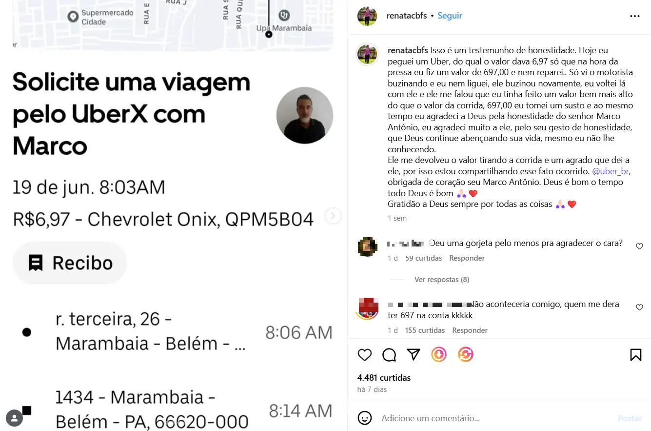 Uma história de honestidade vem ganhando admiração e curtidas nas redes sociais. Em Belém (PA), uma passageira pagou por engano uma quantia cem vezes maior do que o valor correto da corrida de aplicativo. O trajeto custaria R$ 6,97, mas a pressa fez com que ela digitasse R$ 697. O equívoco só foi percebido pelo motorista, que não hesitou em alertar a passageira e devolver o valor excedente.