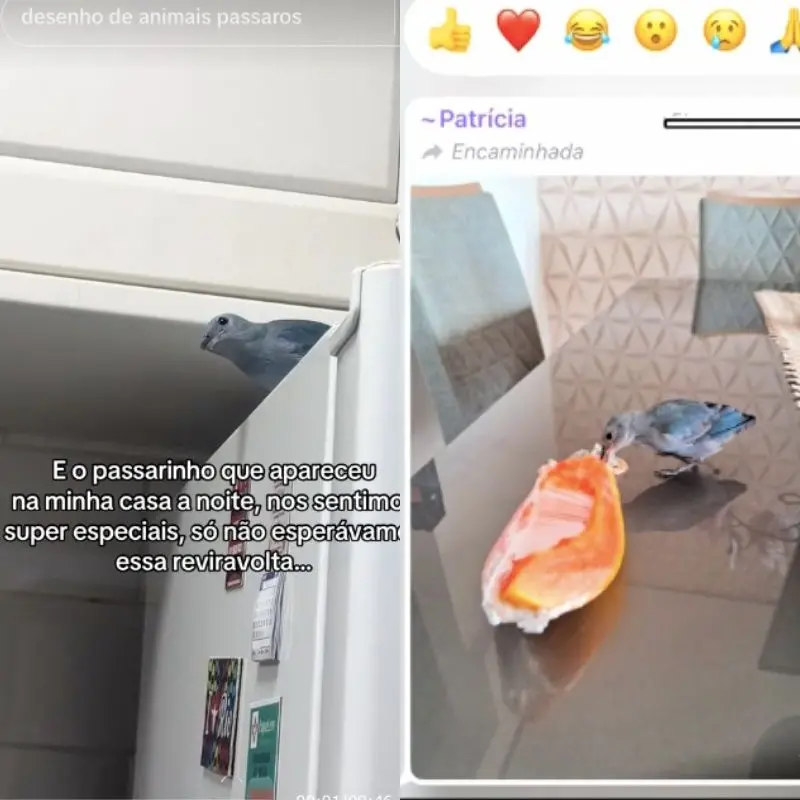 Maria Eduarda reuniu os prints e fez o vídeo do TikTok, mostrando as “aventuras” do passarinho. “Ele apareceu na minha casa à noite, nos sentimos super especiais… só não esperávamos essa reviravolta”, escreveu na legenda.