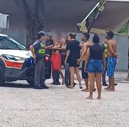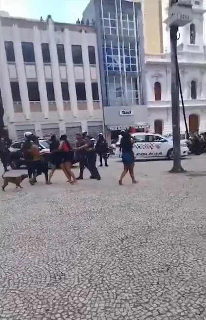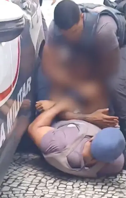 Em seguida, o homem é levado para perto da viatura da PM e dois policiais tentam imobilizá-lo. Moradores em situação de rua tentaram ajudá-lo, mas um policial usa cassetete para contê-los.