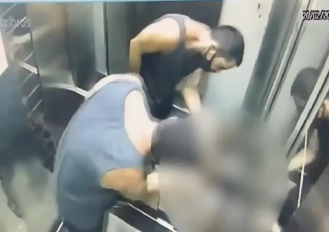 O outro vídeo é de uma câmera do elevador que mostra o homem colocando a mão na boca e no nariz do menino.