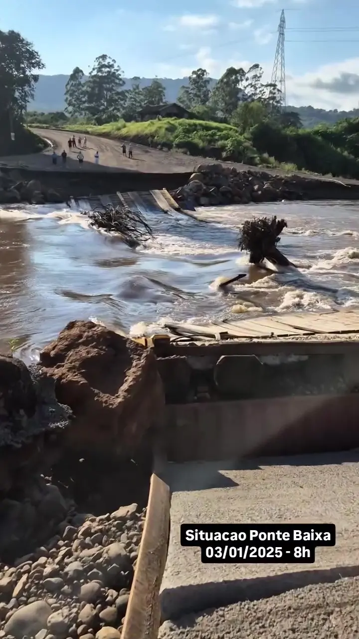 Também nas redes, o prefeito de Feliz, Júnior Freiberger (PSD), publicou um vídeo ao lado da estrutura levada pela água e lamentou o ocorrido. "Ainda não sabemos a proporção dos danos, mas pedimos à população para ter cuidado nessa área, pois é um ambiente de risco. Mas de fato, hoje passamos a ter um grande problema na nossa mobilidade", lamentou.