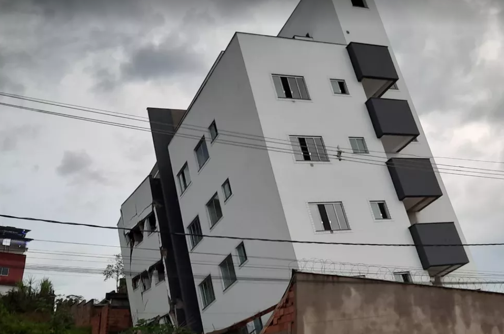 Um prédio em construção localizado no município de Betim, na Grande Belo Horizonte, tombou na noite desta terça-feira (17) e ameaça cair. De acordo com o Corpo de Bombeiros da cidade parte do terreno onde fica o prédio cedeu e deixou a estrutura tombada. As recentes chuvas que caíram em Betim podem ter contribuído para que o terreno cedesse, segundo os bombeiros.