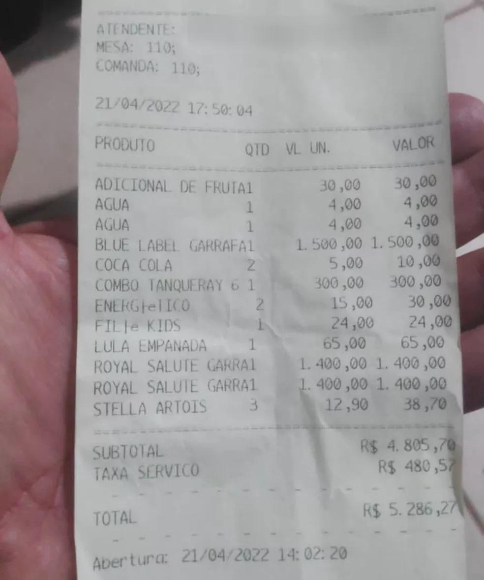 A conta do suspeito totalizou R$ 5.286,27. Entre os itens da comanda, havia um whisky no valor de R$ 1.500 e outros dois de R$ 1.400 cada. O combo de gin com tônicas custou R$ 300, além do adicional de frutas calculado em R$ 30. O homem também consumiu águas, refrigerantes e cervejas. A lula empanada era R$ 65.