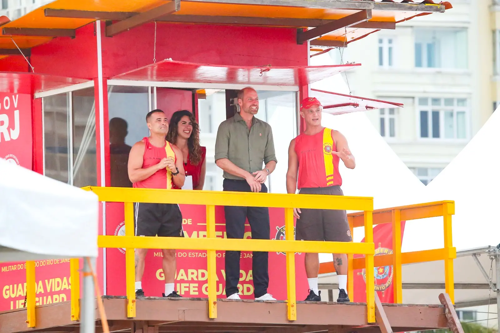 Seguindo a agenda do dia, o príncipe William visitou a praia de Copacabana no fim da tarde desta segunda-feira e acompanhou uma simulação de resgate de afogamento junto ao Corpo de Bombeiros.