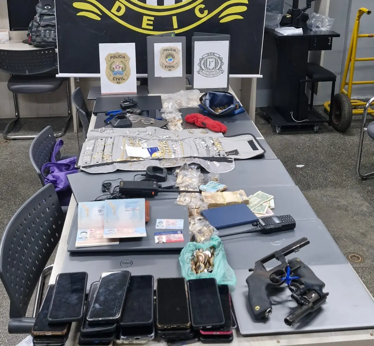 As equipes do Grupo Especial de Reação (GER) foram até o esconderijo e apreenderam 20 notebooks, 29 celulares, duas armas de fogo, dois rádios transmissores, além de mais valores em dinheiro, ferramentas usadas para os arrombamentos nos bancos e documentos pessoais.