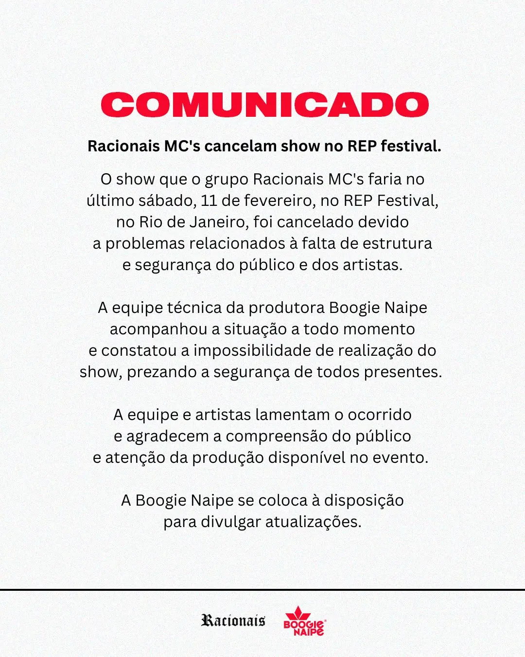 Contudo, os Racionais MC's, maior grupo de rap da história do Brasil, anunciou o cancelamento da apresentação por falta de estrutura.