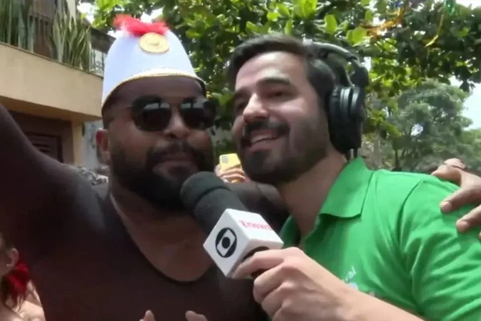 Guilherme Pimentel se mostrou constrangido. "A gente tem que ouvir essas no Carnaval, né, Alan?! Volto com você", disse o repórter, ao passar a palavra para o apresentador Alan Severiano.