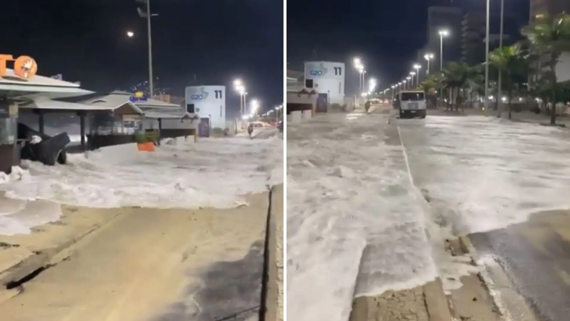 Em imagens publicadas no X, antigo Twitter, é possível observar a água se espalhando pela pista, após uma forte onda atingir um trecho do famoso calçadão. Outros registros mostram a calçada e a via tomadas por areia trazida pelo mar.