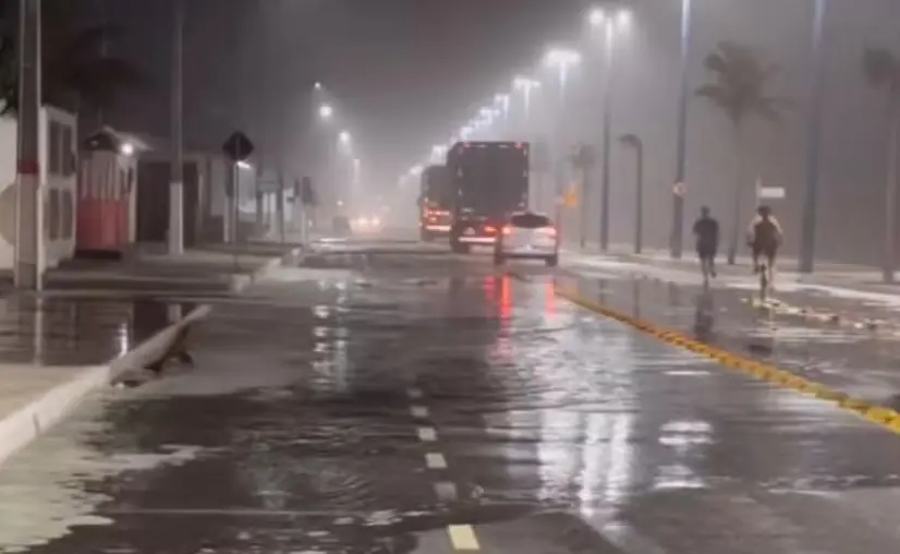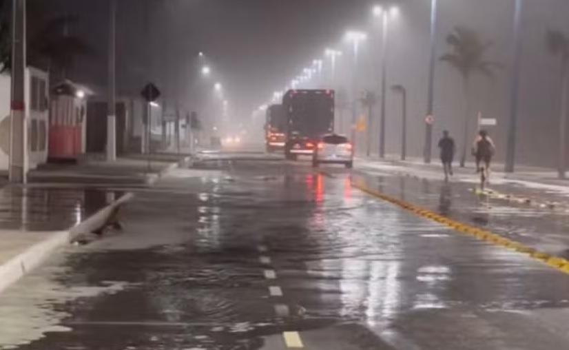 Vídeos postados nas redes sociais mostram trechos de vias com água do mar e outros com enxurradas no asfalto, que ficou coberto de areia.